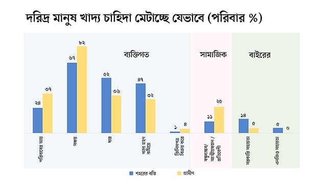 এমন পরিস্থিতিতে কীভাবে নিজেদের খাবার সংগ্রহ করছে? বেশির ভাগ মানুষ বলেছে, এ ক্ষেত্রে তারা নিজেদের করা সঞ্চয় ভাঙছে। আর এর পাশাপাশি ধারদেনা করে বা প্রতিবেশী বন্ধু ও আত্মীয়দের সহযোগিতা নিয়ে পরিস্থিতি সামাল দিচ্ছে। আর খাবার কমিয়েও এ পরিস্থিতির সঙ্গে যুঝছে মানুষ। মাত্র ১৪ শতাংশের মতো মানুষ বলেছে, তারা সরকারি সহায়তা পেয়েছে। আর ৫ শতাংশ পেয়েছে এনজিওর সহায়তা।