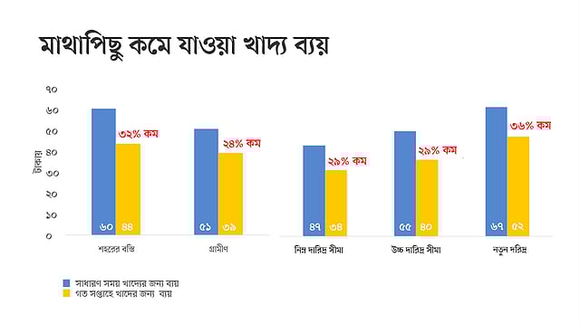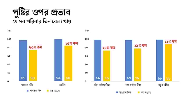 করোনার কারণে সৃষ্ট পরিস্থিতিতে শহরে কাজ হারিয়েছেন ৭১ শতাংশ শ্রমজীবী মানুষ। গ্রামে এ সংখ্যা অপেক্ষাকৃত কম, ৫৫ শতাংশ। এ পরিস্থিতিতে খাবারের জন্য ব্যয় কমিয়ে দিতে বাধ্য হয়েছে মানুষ। এর মধ্যে সবচেয়ে বড় শিকার নতুন দরিদ্ররা। তাদের ৩৬ শতাংশ ব্যয় কমাতে হয়েছে। এ পরিস্থিতিতে এসব মানুষের পুষ্টি পরিস্থিতির ওপর মারাত্মক প্রভাব পড়েছে। বিশেষ করে শহরাঞ্চলে। সেখানে পুষ্টির পরিমাণ কমেছে ২৩ শতাংশ, গ্রামে ১৫ শতাংশ। শহরে মানুষের খাবারের পরিমাণ কমে গেছে ৪৭ ভাগ, গ্রামে ৩২ ভাগ।