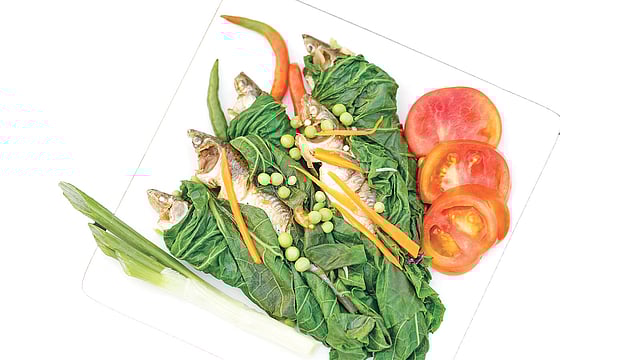উপকরণ: টাটকিনি মাছ ৮টি, লাউপাতা ৮টি, টমেটো ২টি, পেঁয়াজকুচি আধা কাপ, কাঁচা মরিচবাটা ১ চা–চামচ, কাঁচা মরিচ ৮টি, হলুদগুঁড়া সামান্য, লবণ পরিমাণমতো, ধনেপাতাকুচি ২ টেবিল চামচ, পেঁয়াজপাতা ১টি, সরিষার তেল ১ টেবিল চামচ।