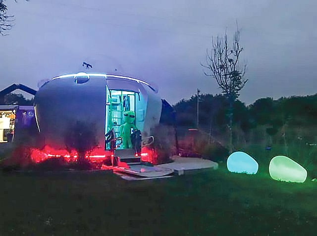 ২০১২ সালের লন্ডন অলিম্পিক শেষে ওয়েলশের এই যুগল কিনে নেন অলিম্পিকে ব্যবহৃত বড় আকারের একটি কনটেইনার। এরপর প্রায় এক বছর কাজ করে সেটিকে দেন ফ্লাইং সসারের রূপ। চারপাশে এলইডির আলোকসজ্জা, সঙ্গে ভেতরের মহাকাশযানের কায়দায় সাজানো কক্ষ তৈরি করে বৈজ্ঞানিক কল্পকথার পরিবেশ। সঙ্গে দরজায় সদা প্রস্তুত এলিয়েনের পুতুল তো আছেই!