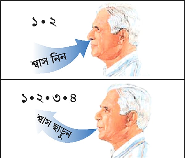 ধীরে ধীরে নাক দিয়ে শ্বাস নিন, কয়েক সেকেন্ড ধরে রাখুন। প্রথম দিকে তিন সেকেন্ড দিয়ে শুরু করুন, পরে সময় বাড়াবেন।