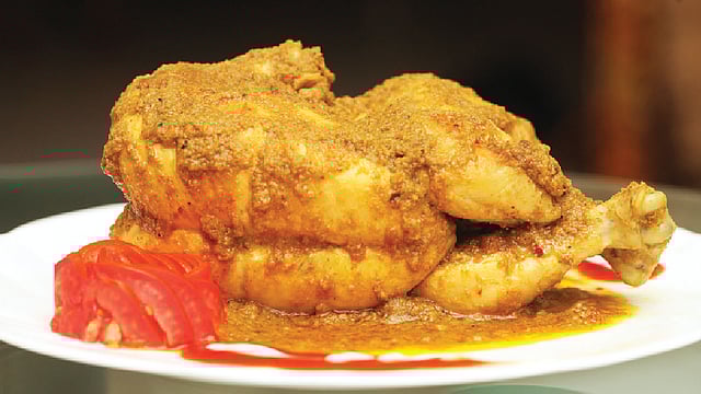 ভেজে রাখা রাইস দিয়ে মুরগির পেটের ভেতর স্টাফিং করে পা দুটি বেঁধে রাখতে হবে। এখন প্যানে তেল দিয়ে মোটা কাটা পেঁয়াজ ভেজে গোটা রসুন এবং চিকেন দিয়ে সামান্য পানি দিয়ে ঢেকে অল্প আঁচে ৩০-৩৫ মিনিটি রান্না করতে হবে। যখন মুরগি সুন্দর সেদ্ধ হয়ে মসলা ঘন হয়ে আসবে তখন ১ টেবিল চামচ মাখন দিয়ে ফোড়ন দিতে হবে। এরপর পরিবেশন করুন।