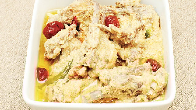 ২. চিংড়ি মাছ মাঝারি ৫০০ গ্রাম, টকদই আধা কাপ, পেঁয়াজ বাটা আধা কাপ, রসুন বাটা ১ চা-চামচ, আদা বাটা ২ চা-চামচ, এলাচ ও দারুচিনি গুড়া ১ চা-চামচ, চিনি ১ চা-চামচ, মিহি নারকেল বাটা ২ টেবিল চামচ, সোয়াবিন তেল সিকি কাপ, শুকনা মরিচ ভেজে গুড়া ১ টেবিল চামচ, সেদ্ধ মটরশুঁটি ১ কাপ, বুন্দিয়া আলু ১ কাপ ও লবণ পরিমাণমতো।