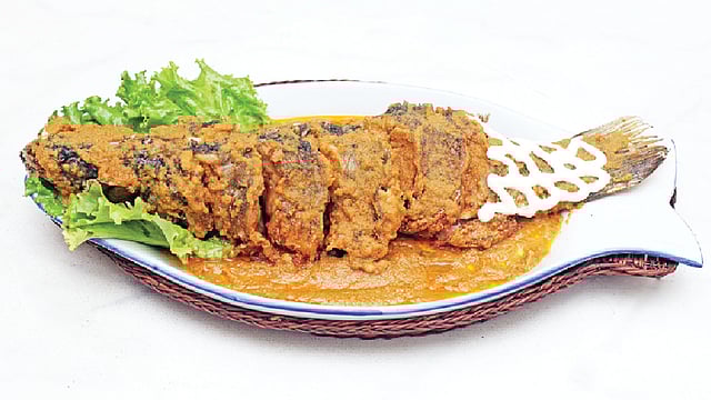 মাছ পরিষ্কার করে লবণ ও লেবুর রস দিয়ে ধুয়ে নিতে হবে ভালোভাবে। এবার মাছটিকে তেরছা তেরছা করে ৪-৫টি ভাগে কাটতে হবে দুই পিঠে। নিচের দিকটা সামান্য চিরে চিরে নিতে হবে। এতে মাছটি সোজাভাবে বসবে।