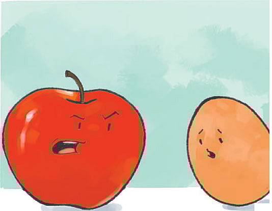 আপেল বলল, ‘বেত্তমিজ! আমার বয়স কত জানিস? আপনি করে বল! প্রথমবার আমাকে যখন কেমিক্যালের রসে ডোবানো হলো, তোর মা তখন তোর মতো ডিম ছিল। সেটা প্রায় বছর তিনেক আগের কথা...’