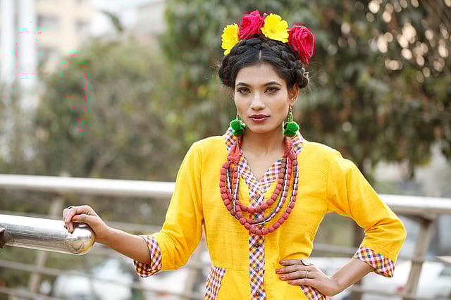লম্বা চুলে তো কমবেশি সবাই বেণি করেন। বেণির ঢংটা এভাবে ফ্রিদা কাহলোর ঢঙে বদলালে কেমন হয়? মাঝখানে সিঁথি করে দুইটা বেণি পাকিয়ে দুই পাশ থেকে মাথার সামনে দিয়ে জড়িয়ে নিয়ে অপর পাশে আটকে দেওয়া হয়েছে। ফুল পরানো হয়েছে মুকুটের মতো করে