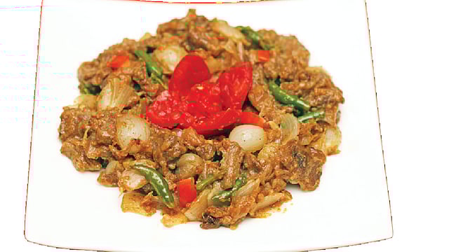 প্রণালি: কর্নফ্লাওয়ার, ভাঁজ খোলা পেঁয়াজ, কাঁচা মরিচ ফালি ও তেল ছাড়া বাকি সব উপকরণ দিয়ে মেখে মাংস ১ ঘণ্টা মেরিনেট করতে হবে। কড়াইয়ে তেল দিয়ে মেরিনেট করা মাংস দিয়ে কষাতে হবে। কষানো হলে সামান্য পানি দিয়ে ঢেকে দিন। মাংস সেদ্ধ হলে তাতে ভাঁজে খোলা কাটা পেঁয়াজ ও কাঁচা মরিচ দিয়ে ৮-১০ মিনিট মৃদু আঁচে ভাজতে হবে। এরপর কর্নফ্লাওয়ার পানিতে গুলে মাংসে ঢেলে দেন। ঝোল ঘন হলে নামিয়ে নিয়ে গরম গরম পরিবেশন করুন।