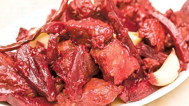 উপকরণ: গরুর মাংস আধা কেজি, বিটরুট (মাঝারি আকারের) ২টি, পেঁয়াজ (মিহি স্লাইস) পৌনে এক কাপ, তেজপাতা ১টি, দারুচিনি (২ সেমি) ২টি, আদা মিহি কুচি (ঝুরি করা) আধা টেবিল চামচ, রসুনকুচি তিন সিকি চা-চামচ, গোটা শুকনা মরিচ ৩টি, টক দই ২ টেবিল চামচ, সিরকা ১ টেবিল চামচ, লবণ ১ চা-চামচ/স্বাদমতো, চিনি ১ চা-চামচ/স্বাদমতো, তেল দেড় টেবিল চামচ, তেল সিকি কাপ, লেবুর রস আধা টেবিল চামচ বা ইচ্ছেমতো।