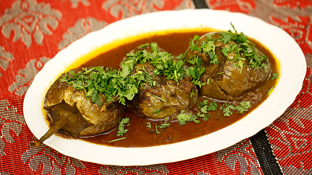প্রণালি: গোল বেগুন মাঝখান থেকে চার ভাগ করে নিন। বোঁটা রেখে দিন। আস্ত বেগুনের মাঝে সব মসলা দিন। তারপর বেগুন একটু নাড়াচাড়া করে পানি দিয়ে দমে দিন। দমে রাখতে হবে আধা ঘণ্টার মতো। এরপর পরিবেশন করুন।