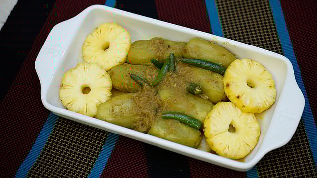 প্রণালি: পটোলের খোসা ছাড়িয়ে একটু ভাপিয়ে নিন। যাতে যখন বিচি বের করবেন, তখন যাতে ফেটে না যায়। তারপর দুই পাশ দিয়ে কেটে বিচি বের করে তার মধ্যে মুরগির কিমা দিন। মুরগির কিমাকে পটোলের ভেতরে ভরার আগে রসুনবাটা ১ চামচ, পেঁয়াজকুচি, কাঁচা মরিচ কুচানো ৩টি, লবণ, হলুগুড়া, মরিচের গুঁড়া, জিরার গুঁড়া, ১/২ চামচ করে, গরমমসলা গুঁড়ো এক চিমটি, চিনি সামান্য দিয়ে ভালো করে মেখে নিন। পাত্রে ১ চামচমতো তেল গরম করে পুরোটা ভেজে নিন। ঠান্ডা হয়ে এলে পুরো এবার একটু করে ভাজা পটোলের মধ্যে ঢুকিয়ে দিন। পটোলের মধ্যে পুর ভরা হয়ে এলে খোলা মুখ ময়দা দিয়ে বন্ধ করে দিন। আবার তেল গরম করে ময়দা দেওয়া আছে, সেদিকটা তেলে দিয়ে পটোলগুলো ভেজে তুলে রেখে দিন। এবার আরও একটু তেল গরম করে বাকি পেঁয়াজকুচি লাল করে ভেজে নিয়ে টমেটো দিয়ে দিন পানি বের হলে সব মসলা একে একে দিয়ে কষে নিন। তেল ছাড়লে পুরভরা পটোলগুলো দিয়ে একটু নেড়ে ১ কাপমতো পানি দিন। নামানোর আগে আনারস কেটে সাজিয়ে পরিবেশন করুন।