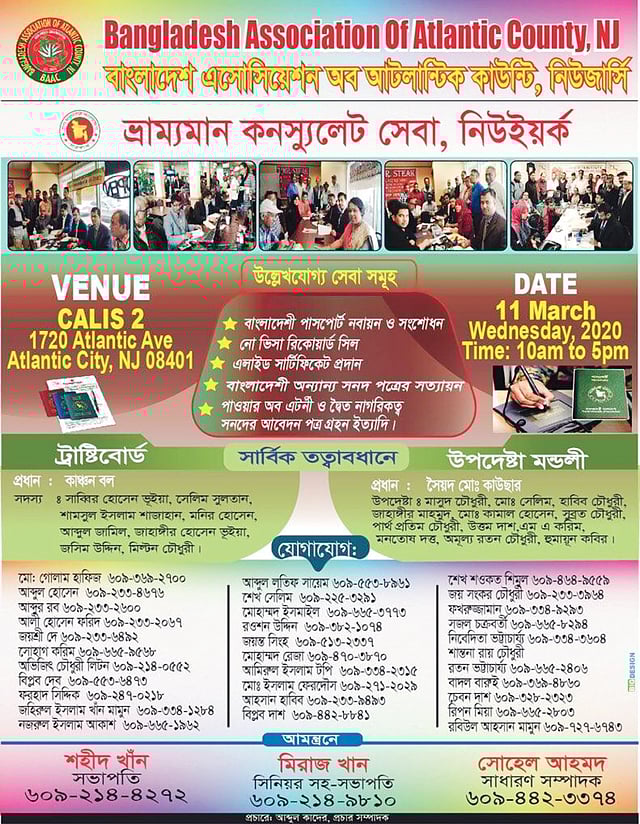 বাংলাদেশ অ্যাসোসিয়েশন অব আটলান্টিক কাউনটির সভাপতি শহীদ খান ও সাধারণ সম্পাদক সোহেল আহমদ প্রবাসী বাংলাদেশিদের ভ্রাম্যমাণ কনস্যুলেটের সেবা গ্রহণ করার আহ্বান জানিয়েছেন।