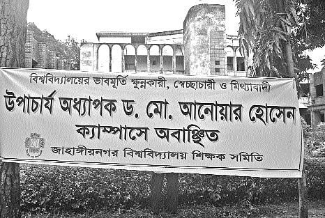 গত ১৯ জুন অনুষ্ঠিত জাহাঙ্গীরনগর বিশ্ববিদ্যালয় শিক্ষক সমিতির সাধারণ সভায় উপাচার্যবিরোধী আন্দোলনের নতুন কর্মসূচি দেওয়া হয়। সমিতি স্থির করে ছাত্রছাত্রীদের ক্লাস নেওয়া তারা আবার শুরু করবে, যা তারা বন্ধ রেখেছিল উপাচার্যের পদত্যাগের দাবিতে। একই সঙ্গে আগে ঘোষিত উপাচার্যের পদত্যাগের জন্য চলমান আন্দোলন তীব্র করার লক্ষ্যে উপাচার্যকে জাহাঙ্গীরনগর বিশ্ববিদ্যালয়ে ‘অবাঞ্ছিত’ ঘোষণা করা হয়। ‘অবাঞ্ছিত’ উপাচার্যকে পদত্যাগে বাধ্য না করা পর্যন্ত প্রশাসনিক কার্যালয়ে তালা লাগিয়ে দেয় তারা। তাদের সিদ্ধান্তমতে, বর্তমান উপাচার্য জাহাঙ্গীরনগর বিশ্ববিদ্যালয়ের স্বার্থপরিপন্থী কর্মকাণ্ডে লিপ্ত থেকে এই বিশ্ববিদ্যালয়ের উপাচার্য পদে থাকার নৈতিক অধিকার হারিয়েছেন। তাই সমিতির এই সভা উপাচার্য হিসেবে অধ্যাপক মো. আনোয়ার হোসেনের পদত্যাগ বা অপসারণের দাবি জানাচ্ছে এবং তাঁকে এই বিশ্ববিদ্যালয়ে অবাঞ্ছিত ঘোষণা করছে। বিষয়টি নিয়ে আমি গভীরভাবে ভেবেছি। আত্মজিজ্ঞাসায় ব্রতী হয়েছি। বিশ্ববিদ্যালয় পরিচালনায় নৈতিক ভিত্তি হারিয়ে ফেলা বিষয়ে সমিতির দাবির সঙ্গে কোনোভাবেই একমত হতে পারিনি। সমাজে ‘অবাঞ্ছিত’ হিসেবে কাউকে ঘোষণা করার ঐতিহাসিক প্রেক্ষাপটটি সম্পর্কে শুরুতে বলেছি। জাহাঙ্গীরনগর ক্যাম্পাসে আমাকে ‘অবাঞ্ছিত’ ঘোষণা করা হয়েছে হয়তো এ কারণে যে আমি এই বিশ্ববিদ্যালয়ের ছাত্র বা শিক্ষক ছিলাম না। তাই এই ক্যাম্পাস আমাকে ত্যাজ্য করেছে। এমন ভাবনা আমাকে গভীরভাবে মর্মাহত করেছে। শিক্ষক সমিতি শুধু ‘অবাঞ্ছিত’ ঘোষণা করেই ক্ষান্ত হয়নি। প্রশাসনিক ভবন থেকে শুরু করে বিশ্ববিদ্যালয়ের বিভিন্ন পয়েন্টে ‘বিশ্ববিদ্যালয়ের ভাবমূর্তি ক্ষুণ্নকারী, স্বেচ্ছাচারী ও মিথ্যাবাদী উপাচার্য অধ্যাপক ড. মো. আনোয়ার হোসেন ক্যাম্পাসে অবাঞ্ছিত’—এই শিরোনামের ব্যানার তারা টানিয়ে দেয়। এমনকি আমার বাসভবনের প্রবেশমুখের কাছে এমন একটি ব্যানার টানানো হয়। দড়ি ছিঁড়ে ব্যানারটি নিচে পড়ে যায় একসময়। আমার স্ত্রী তা দেখে বাসার কর্মচারীদের দিয়ে ব্যানারটি আবার সেখানে টানিয়ে দেন। এটা তিনি করেন এ জন্য যে আন্দোলনকারী শিক্ষকেরা যেন ভুল না বোঝেন। উপাচার্যের নির্দেশে ব্যানারটি খুলে ফেলার চেষ্টা হয়েছে—এমন অপবাদ যেন তাঁরা না দেন। কিন্তু গভীর বেদনায় স্ত্রী, পুত্র, কন্যা, পুত্রবধূকে নিয়ে ব্যানারের অমানবিক এবং অশিষ্ট কথাগুলো আমাদের পড়ে যেতে হয়েছে।