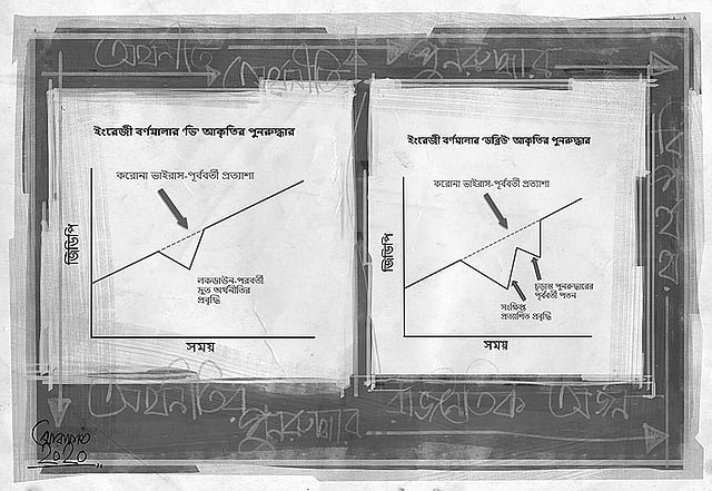 বিভিন্ন দেশে এ ধরনের বিপর্যয়ের পর অর্থনীতি পুনরুদ্ধারের তথ্য বিশ্লেষণ করে দেখা যায় যে এটা পাঁচটি সম্ভাব্য পথ অনুসরণ করে থাকে। ১. অর্থনীতি যদি দ্রুত পুনরুদ্ধার হয়, তাহলে তা হবে ইংরেজি বর্ণমালা ‘ভি’–এর মতো। অর্থাৎ দ্রুত খাদে নেমে আবার দ্রুত উঠে আসে। ২. বিপর্যয় যদি পরপর দুবার হয় এবং প্রতিবারই খাদ থেকে দ্রুত অর্থনীতি পুনরুদ্ধার হয়, তাহলে তা হবে ইংরেজি বর্ণমালা ‘ডব্লিউ’–এর মতো। ৩. অর্থনীতি পুনরুদ্ধার যদি বিলম্বিত হয়, তবে তা হবে ইংরেজি বর্ণমালা ‘ইউ’–এর মতো। অর্থাৎ দ্রুত উঠে না এসে বেশ কিছুটা সময় খাদে থেকে বেশ পরে অর্থনীতি আগের পর্যায়ে এসে আবার প্রবৃদ্ধি অর্জন করে। ৪. হতাশাজনক পরিস্থিতি হচ্ছে অর্থনীতি খাদ থেকে উঠতে না পেরে খাদেই অগ্রসর হতে থাকে, যা ইংরেজি বর্ণমালা ‘এল’–এর মতো। ৫. সবচেয়ে হতাশাজনক হচ্ছে ওপরে–নিচে দুটো ‘এল’ অর্থাৎ সিঁড়ির মতো খাদে পড়ার পর না উঠেই আবার খাদে পড়া এবং নিচের খাদেই অগ্রসর হতে থাকে।