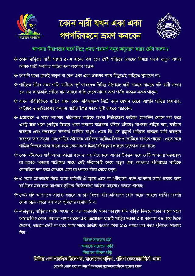 সম্প্রতি গণপরিবহনে নারীর নিরাপত্তা বিষয়ে দারুণ উদ্বেগ প্রতিফলিত হয়েছে বাংলাদেশ পুলিশের সচেতনতামূলক একটি প্রচারণা বার্তায়। বার্তাটি নারীকে উদ্দেশ করে লিখিত। বার্তাটিতে মূলত নারীকে সচেতন করা হয়েছে, তিনি যখন একা একা গণপরিবহনে ভ্রমণ করবেন, তখন তিনি তাঁর নিরাপত্তার স্বার্থে কী কী সাবধানতামূলক পদক্ষেপ গ্রহণ করবেন এ বিষয়ে। বার্তাটির উদ্দেশ্য ভালো, তাতে সন্দেহ নেই। কিন্তু যে কৌশলে বার্তাটি রচনা ও পরিবেশন করা হয়েছে, তাতে পুনর্বার প্রতিফলিত হয়েছে সেই সনাতনী পুরুষতান্ত্রিক ধ্যানধারণা; যে ধ্যানধারণা প্রতিষ্ঠা করে নারীর সমস্যা নিতান্তই নারীর একার। তাই তার সমাধানও চাপিয়ে দেওয়া হয়েছে নারীর ওপর। অপরাধ যারই হোক না কেন নারীর নিরাপত্তা রক্ষার সব দায়ভার যেন নারীর একার। সেখানে পুরুষের কোনো অংশগ্রহণ নেই, নেই কোনো অংশীদারত্ব।