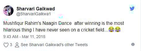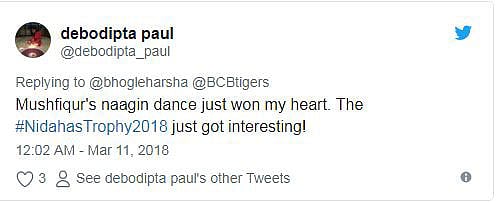 বাংলাদেশের রেকর্ড রান তাড়ার এই জয়ের আলোচনা তো সামাজিক যোগাযোগের মাধ্যমে হয়েছেই। মুশফিকের ‘নাগিন নাচ’ কিন্তু কম আলোচনা ছড়ায়নি। টুইটারে অনেকেই তো জিজ্ঞেস করেছেন, মুশফিক নিশ্চয়ই সদ্য প্রয়াত বলিউড অভিনেত্রী শ্রীদেবীর খুব বড় ফ্যান!