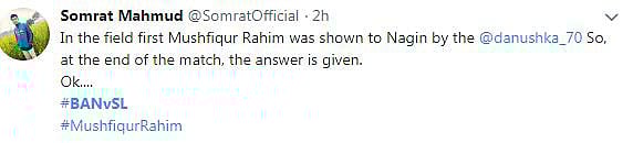 নেপথ্য কারণ যা-ই হোক মুশফিকের এই ‘নাগিন নৃত্য’ এই মুহূর্তে দারুণ আলোচিত। নিজের ৩৫ বলে ৭২ রানের ইনিংসটা দিয়ে বাংলাদেশকে অবিস্মরণীয় এক জয় এনে দেওয়া মুশফিক না হয় কলম্বোর প্রেমাদাসা স্টেডিয়ামের এই ম্যাচটিকে অন্যমাত্রা দিয়েছেন এই নাগিন নাচের মধ্য দিয়েই।