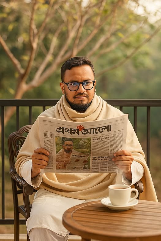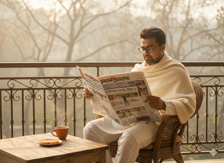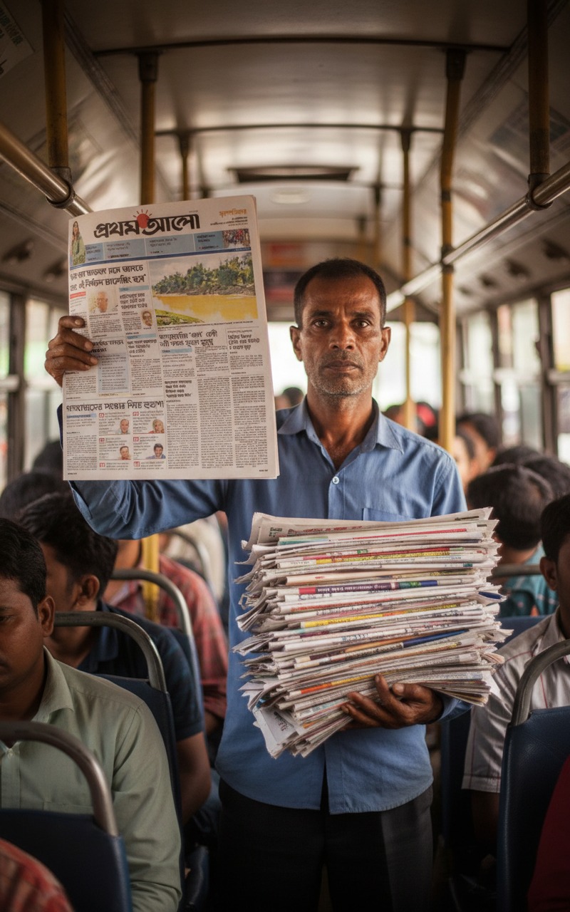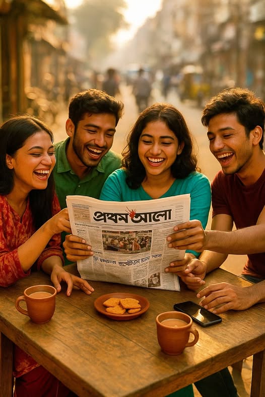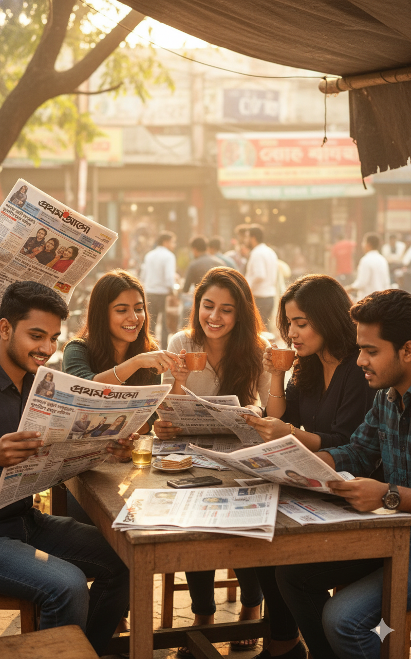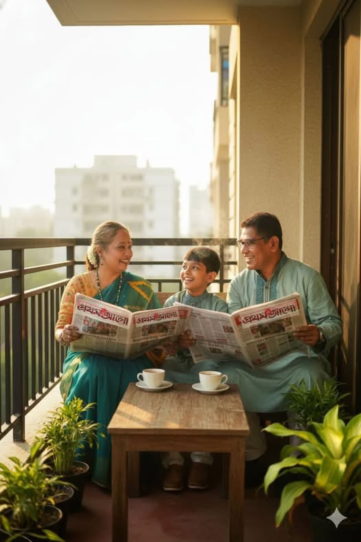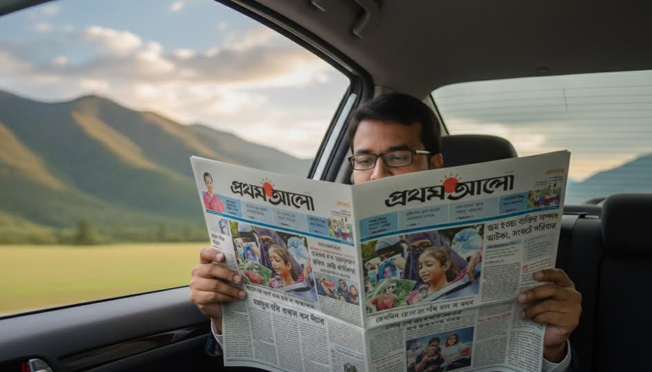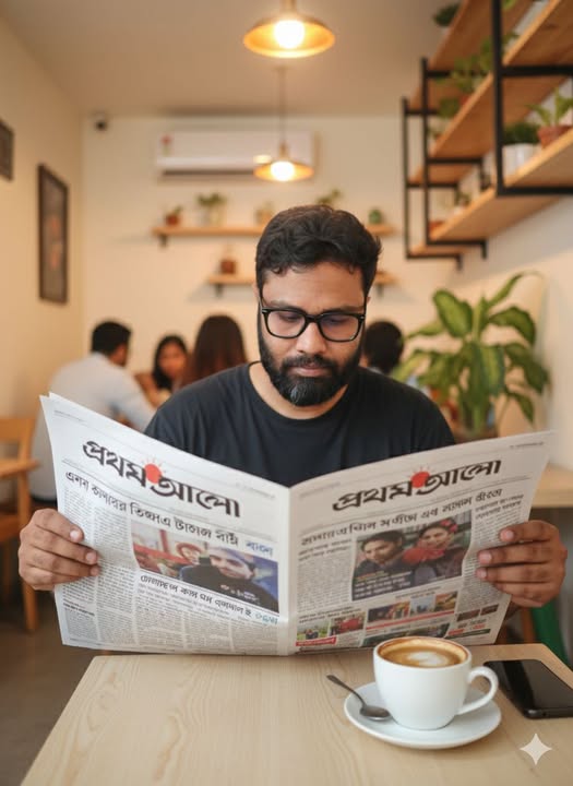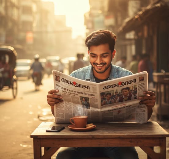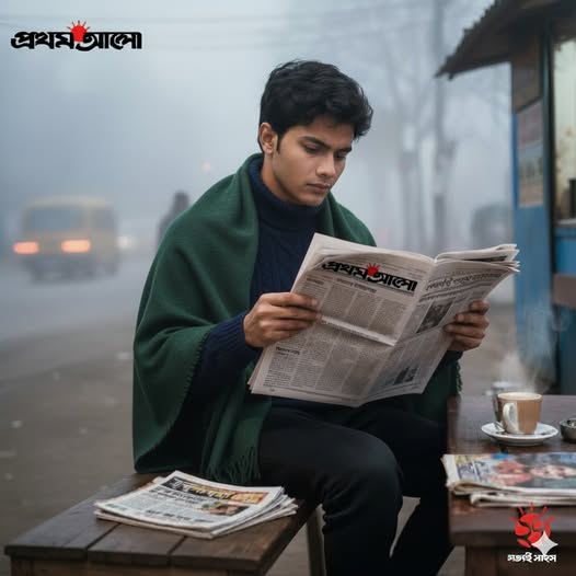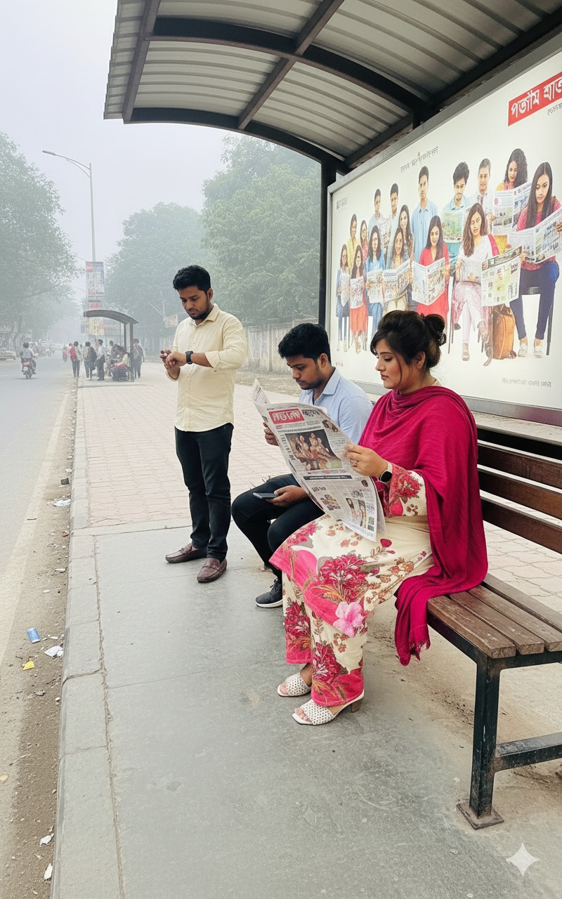 বাস স্ট্যান্ডে একটি যাত্রী ছাউনিতে ডান পাশে বসে প্রথম আলো পত্রিকা পড়ছেন একজন মহিলা। তিনি আপনার দেওয়া ছবিতে পরা ফুল প্রিন্টের সালোয়ার কামিজ এবং মেরুন ওড়না পরে আছেন। তিনি সাইড অ্যাঙ্গেলে বসে আছেন এবং তাঁর সামনে পত্রিকাটি খোলা। তাঁর বাম পাশে বসে আছে একটি ছেলে এবং তার বাম পাশে এক জন লোক দাঁড়িয়ে আছে। দাঁড়িয়ে থাকা একজন তার হাতের ঘড়ি দেখছে। ছবিটির অ্যাঙ্গেল ল্যান্ডস্কেপ হবে, যাতে আপনাদের ঠিকভাবে বোঝা যায় এবং রাস্তার কিছু অংশ দেখা যায় যেন বাস স্ট্যান্ড মনে হয়। যাত্রী ছাউনির ঠিক পিছনে একটি বড় বিলবোর্ড বা বিজ্ঞাপন থাকবে, যেখানে অনেক লোক একসাথে মনোযোগ দিয়ে প্রথম আলো পত্রিকা পড়ছে এমন একটি দৃশ্য দেখানো হচ্ছে।