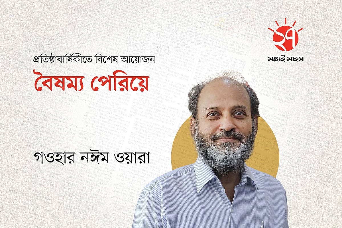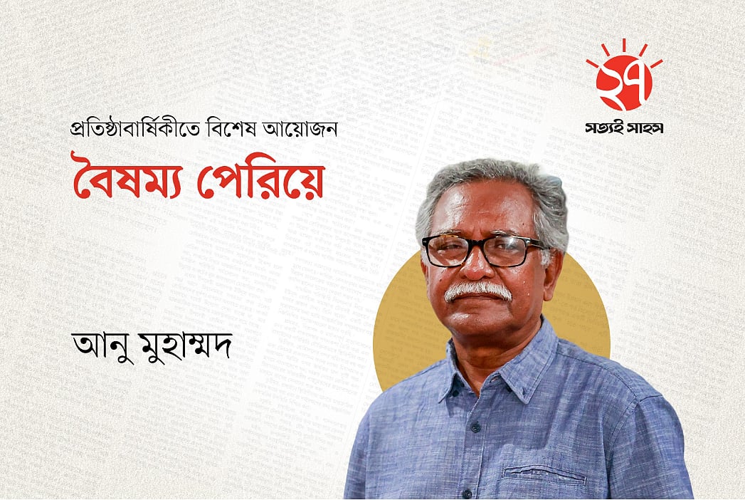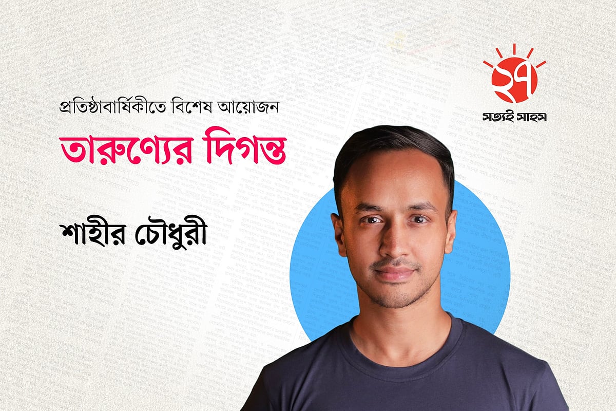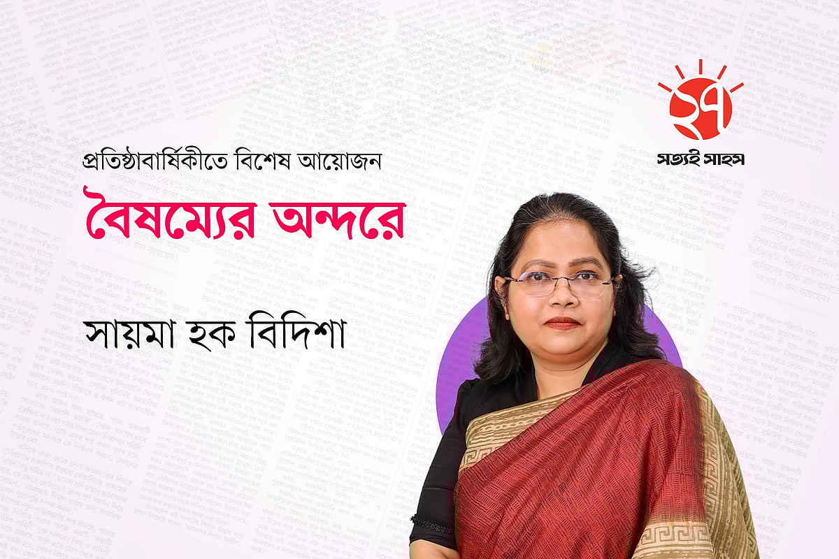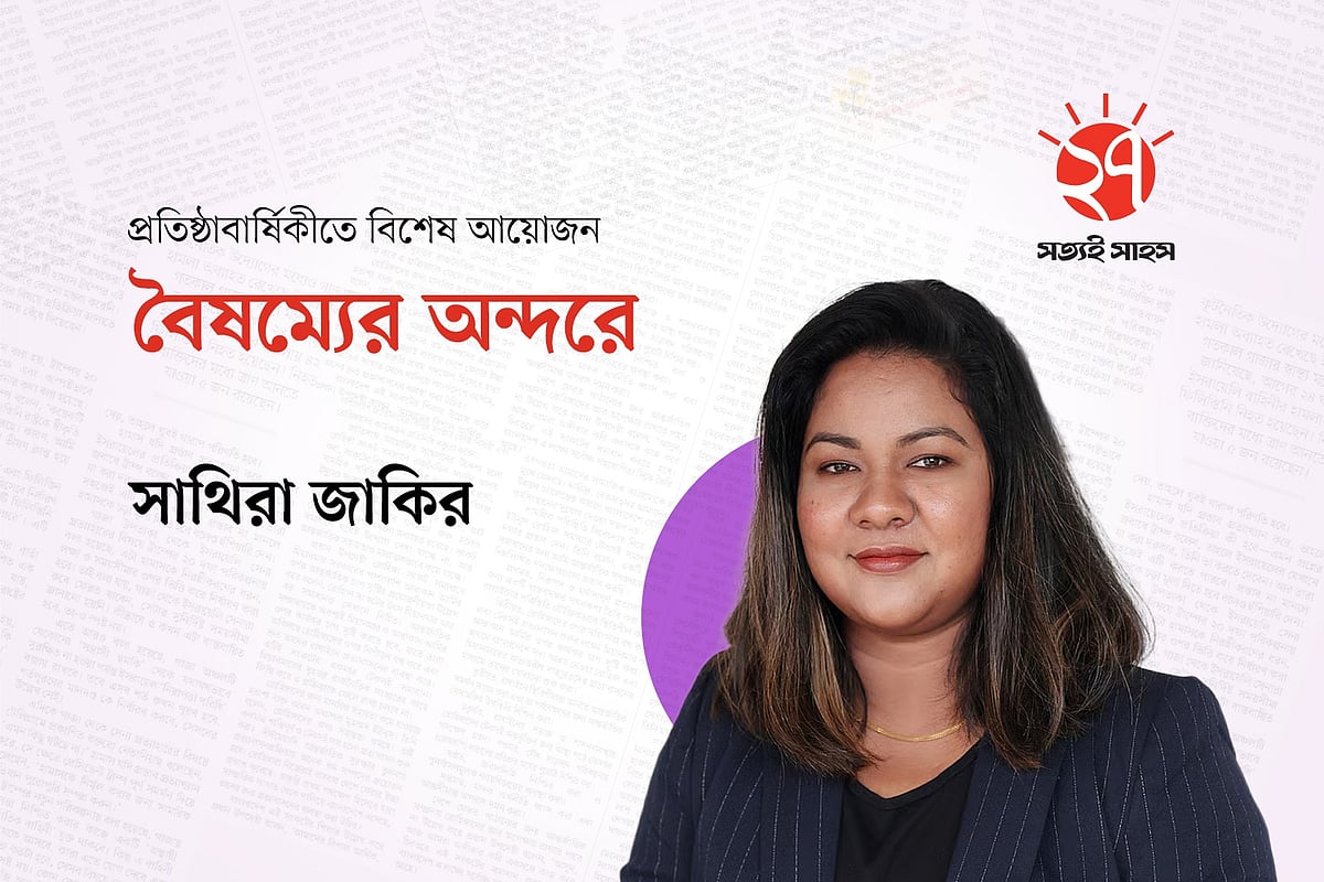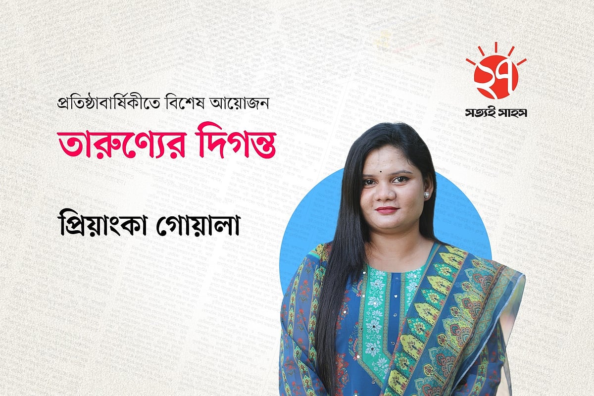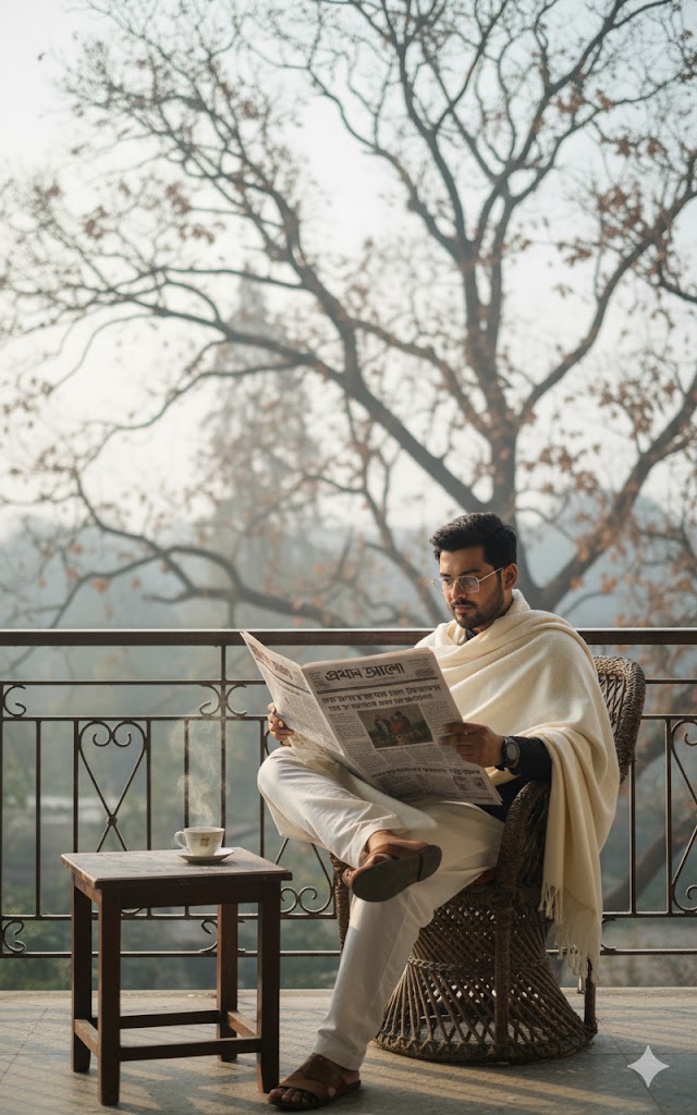 বাস স্ট্যান্ডে একটি যাত্রী ছাউনিতে ডান পাশে বসে প্রথম আলো পত্রিকা পড়ছেন একজন মহিলা। তিনি আপনার দেওয়া ছবিতে পরা ফুল প্রিন্টের সালোয়ার কামিজ এবং মেরুন ওড়না পরে আছেন। তিনি সাইড অ্যাঙ্গেলে বসে আছেন এবং তাঁর সামনে পত্রিকাটি খোলা। তাঁর বাম পাশে বসে আছে একটি ছেলে এবং তার বাম পাশে এক জন লোক দাঁড়িয়ে আছে। দাঁড়িয়ে থাকা একজন তার হাতের ঘড়ি দেখছে। ছবিটির অ্যাঙ্গেল ল্যান্ডস্কেপ হবে, যাতে আপনাদের ঠিকভাবে বোঝা যায় এবং রাস্তার কিছু অংশ দেখা যায় যেন বাস স্ট্যান্ড মনে হয়। যাত্রী ছাউনির ঠিক পিছনে একটি বড় বিলবোর্ড বা বিজ্ঞাপন থাকবে, যেখানে অনেক লোক একসাথে মনোযোগ দিয়ে প্রথম আলো পত্রিকা পড়ছে এমন একটি দৃশ্য দেখানো হচ্ছে।